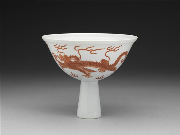 侈口窄唇,唇緣細稜凸起,深壁,高圈足,施白釉。外壁以紅彩描繪雙龍戲珠與火焰紋,碗心書「大清乾隆年製」三行六字篆款,外加雙方框。