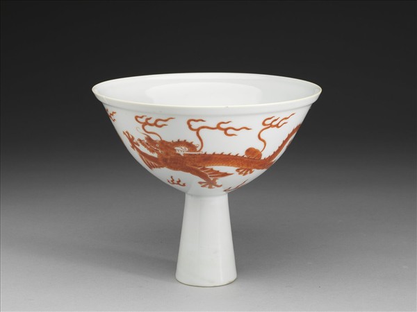 侈口窄唇,唇緣細稜凸起,深壁,高圈足,施白釉。外壁以紅彩描繪雙龍戲珠與火焰紋,碗心書「大清乾隆年製」三行六字篆款,外加雙方框。