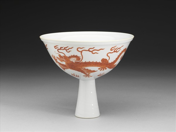 侈口窄唇,唇緣細稜凸起,深壁,高圈足,施白釉。外壁以紅彩描繪雙龍戲珠與火焰紋,碗心書「大清乾隆年製」三行六字篆款,外加雙方框。