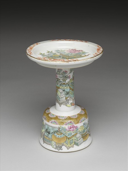 粉彩博古圖燭台式盤