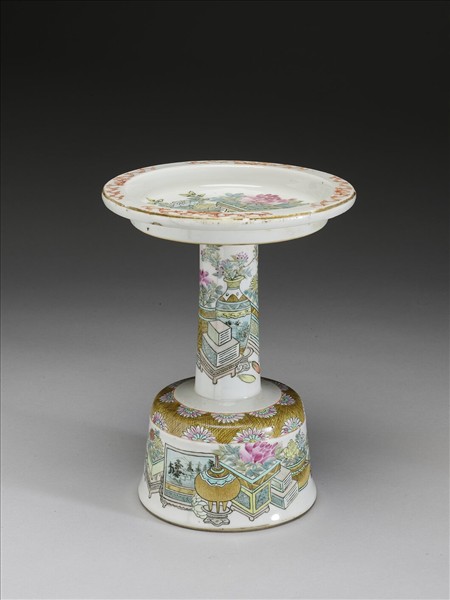 粉彩博古圖燭台式盤