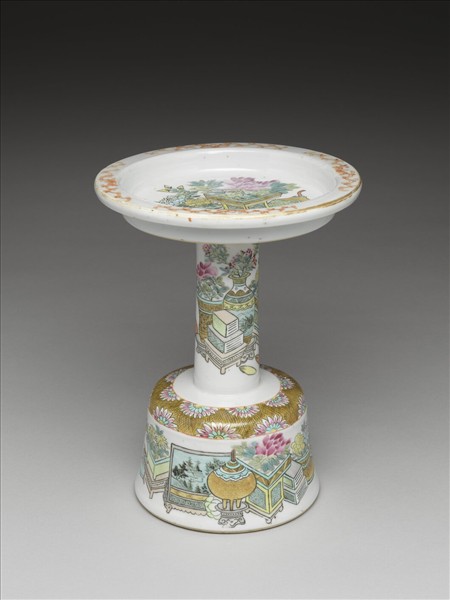 粉彩博古圖燭台式盤