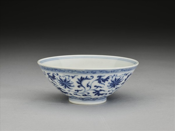 敞口,深壁,矮圈足。外壁畫番蓮五朵,口沿畫卷草紋一周,底邊畫如意雲紋一周,口足間加飾青線五道。碗內口沿畫雙線,底心畫番蓮一朵,邊加雙線。底有青花書「大清乾隆年製」三行六字篆款。