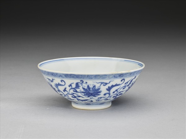 敞口,深壁,矮圈足。外壁畫番蓮五朵,口沿畫卷草紋一周,底邊畫如意雲紋一周,口足間加飾青線五道。碗內口沿畫雙線,底心畫番蓮一朵,邊加雙線。底有青花書「大清乾隆年製」三行六字篆款。
