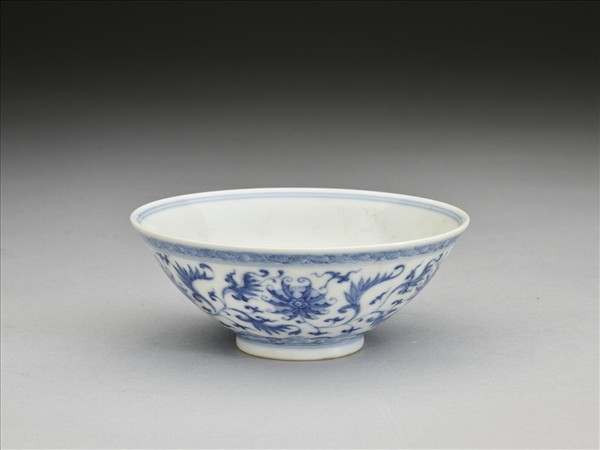 敞口,深壁,矮圈足。外壁畫番蓮五朵,口沿畫卷草紋一周,底邊畫如意雲紋一周,口足間加飾青線五道。碗內口沿畫雙線,底心畫番蓮一朵,邊加雙線。底有青花書「大清乾隆年製」三行六字篆款。