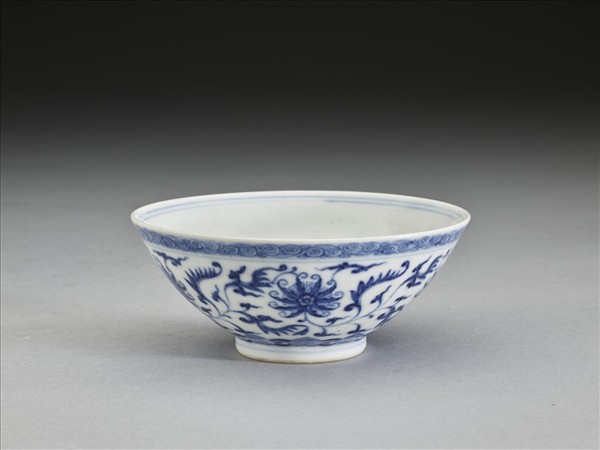 敞口,深壁,矮圈足。外壁畫番蓮五朵,口沿畫卷草紋一周,底邊畫如意雲紋一周,口足間加飾青線五道。碗內口沿畫雙線,底心畫番蓮一朵,邊加雙線。底有青花書「大清乾隆年製」三行六字篆款。