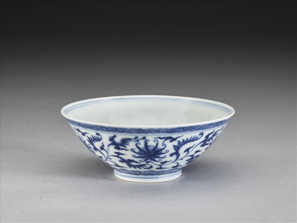 敞口,深壁,矮圈足。外壁畫番蓮五朵,口沿畫卷草紋一周,底邊畫如意雲紋一周,口足間加飾青線五道。碗內口沿畫雙線,底心畫番蓮一朵,邊加雙線。底有青花書「大清乾隆年製」三行六字篆款。