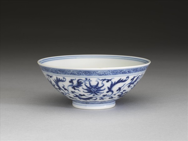 敞口,深壁,矮圈足。外壁畫番蓮五朵,口沿畫卷草紋一周,底邊畫如意雲紋一周,口足間加飾青線五道。碗內口沿畫雙線,底心畫番蓮一朵,邊加雙線。底有青花書「大清乾隆年製」三行六字篆款。