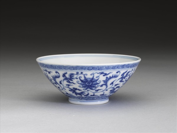 敞口,深壁,矮圈足。外壁畫番蓮五朵,口沿畫卷草紋一周,底邊畫如意雲紋一周,口足間加飾青線五道。碗內口沿畫雙線,底心畫番蓮一朵,邊加雙線。底有青花書「大清乾隆年製」三行六字篆款。