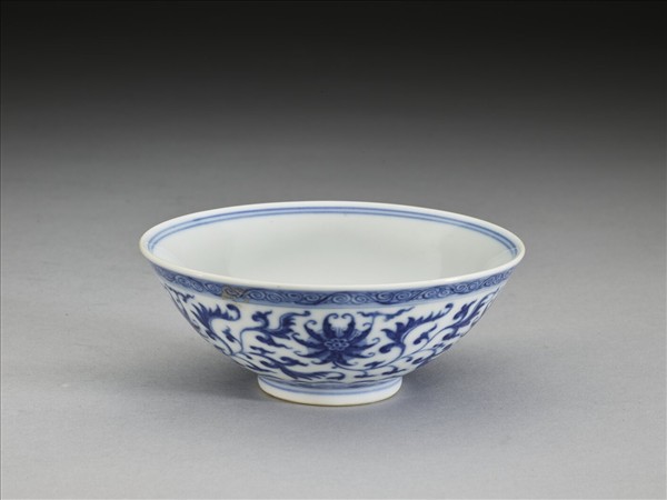 敞口,深壁,矮圈足。外壁畫番蓮五朵,口沿畫卷草紋一周,底邊畫如意雲紋一周,口足間加飾青線五道。碗內口沿畫雙線,底心畫番蓮一朵,邊加雙線。底有青花書「大清乾隆年製」三行六字篆款。