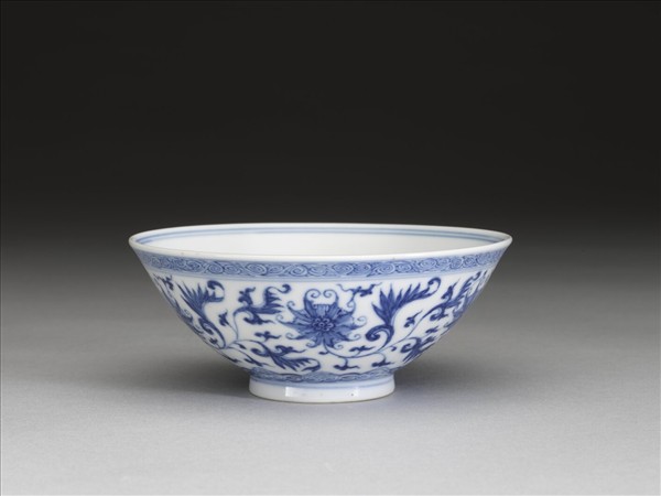 敞口,深壁,矮圈足。外壁畫番蓮五朵,口沿畫卷草紋一周,底邊畫如意雲紋一周,口足間加飾青線五道。碗內口沿畫雙線,底心畫番蓮一朵,邊加雙線。底有青花書「大清乾隆年製」三行六字篆款。