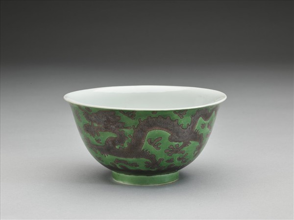 侈口微撇,深壁,矮圈足。外壁以綠釉為地,赭彩繪雙龍戲珠,隙間畫雲紋和火焰紋,底沿繪波濤紋一周。內壁純白,無紋飾。底有青花書「大清乾隆年製」三行六字篆款。
