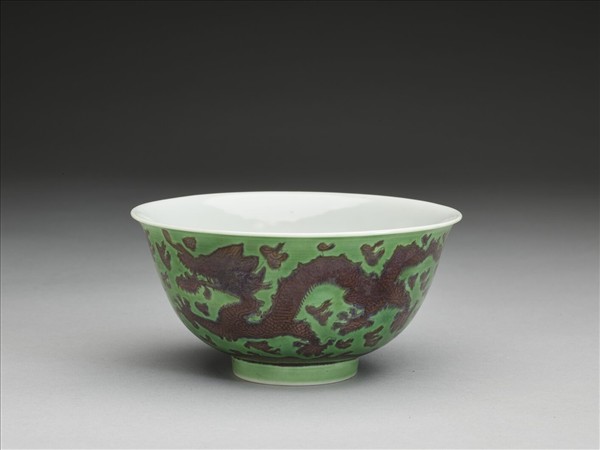 侈口微撇,深壁,矮圈足。外壁以綠釉為地,赭彩繪雙龍戲珠,隙間畫雲紋和火焰紋,底沿繪波濤紋一周。內壁純白,無紋飾。底有青花書「大清乾隆年製」三行六字篆款。