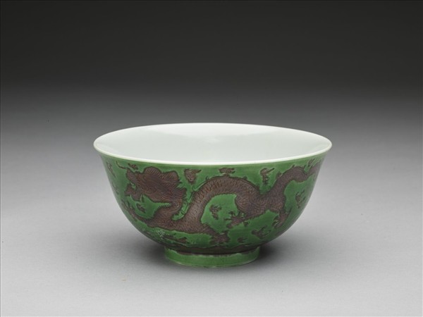 侈口微撇,深壁,矮圈足。外壁以綠釉為地,紫彩繪雙龍戲珠,隙間畫雲紋和火焰紋,底沿繪波濤紋一周。內壁純白,無紋飾。底有青花書「大清道光年製」三行六字篆款。