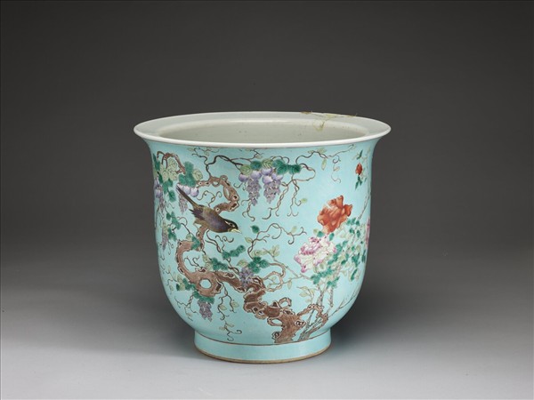 粉彩藍地紫藤花鳥紋花盆
