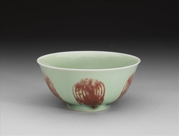 圓口,唇緣微外侈,弧形深壁,平底,矮圈足。器壁通施冬青釉,釉色呈粉綠。外壁裝飾五個紅彩團鳳紋,碗心亦繪一團鳳紋,鳳首、軀體與鳳尾成S型,雙翅展開於兩側,使圖案成圓形,紅彩發色呈鮮紅色,帶綠色苔點。底有青花書「大清雍正年製」二行六字楷款,外加雙圈。