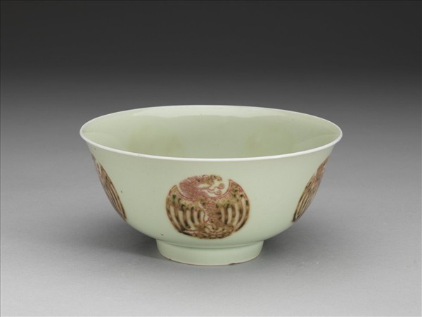 圓口,唇緣微外侈,弧形深壁,平底,矮圈足。器壁通施冬青釉,釉色呈粉綠。外壁裝飾五個紅彩團鳳紋,碗心亦繪一團鳳紋,鳳首、軀體與鳳尾成S型,雙翅展開於兩側,使圖案成圓形,紅彩發色呈淺紅色,帶綠色苔點。底有青花書「大清雍正年製」二行六字楷款,外加雙圈。