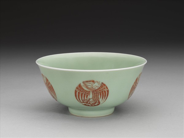 圓口,唇緣微外侈,弧形深壁,平底,矮圈足。器壁通施冬青釉,釉色呈粉綠。外壁裝飾五個描紅團鳳紋,碗心亦繪一團鳳紋,鳳首、軀體與鳳尾成S型,雙翅展開於兩側,使圖案成圓形,線條粗細分明。底有青花書「大清雍正年製」二行六字楷款,外加雙圈。