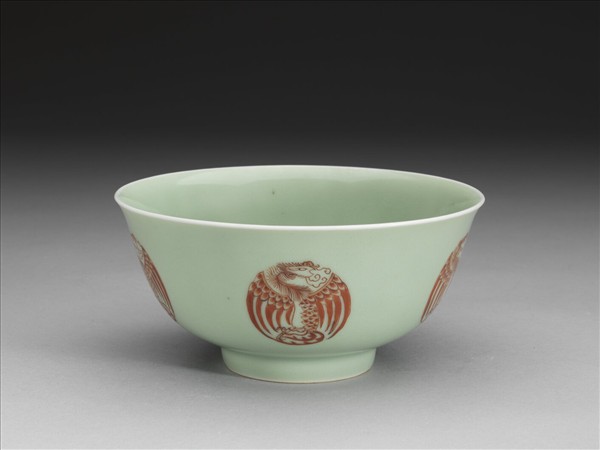 圓口,唇緣微外侈,弧形深壁,平底,矮圈足。器壁通施冬青釉,釉色呈粉綠。外壁裝飾五個描紅團鳳紋,碗心亦繪一團鳳紋,鳳首、軀體與鳳尾成S型,雙翅展開於兩側,使圖案成圓形,線條粗細分明。底有青花書「大清雍正年製」二行六字楷款,外加雙圈。