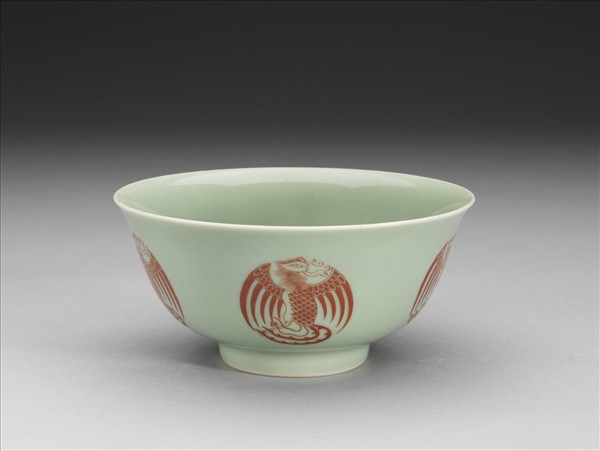 圓口,唇緣微外侈,弧形深壁,平底,矮圈足。器壁通施冬青釉,釉色呈粉綠。外壁裝飾五個描紅團鳳紋,碗心亦繪一團鳳紋,鳳首、軀體與鳳尾成S型,雙翅展開於兩側,使圖案成圓形,線條粗細分明。底有青花書「大清雍正年製」二行六字楷款,外加雙圈。