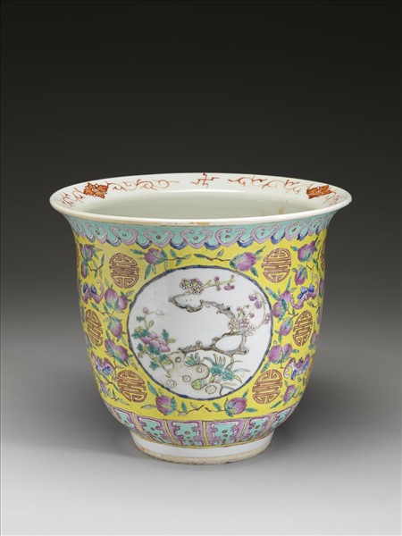 粉彩黃地開光花卉圖花盆