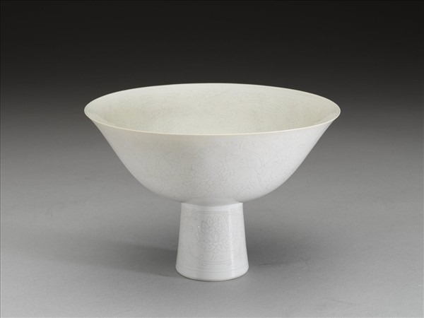 撇口,弧壁,高圈足,足部上窄下寬且中空,近底處微外侈。通體施白釉,白釉泛青,內、外壁飾纏枝番蓮六朵,足壁亦飾纏枝番蓮紋,高足上部與碗底接合處飾蓮瓣紋一周,內、外口沿及足之上下部各加飾細線二道,紋飾刻劃仿透雕效果。胎壁勻薄,足底露胎。碗心有「大清乾隆年製」雙行六字楷款,外加雙圈。