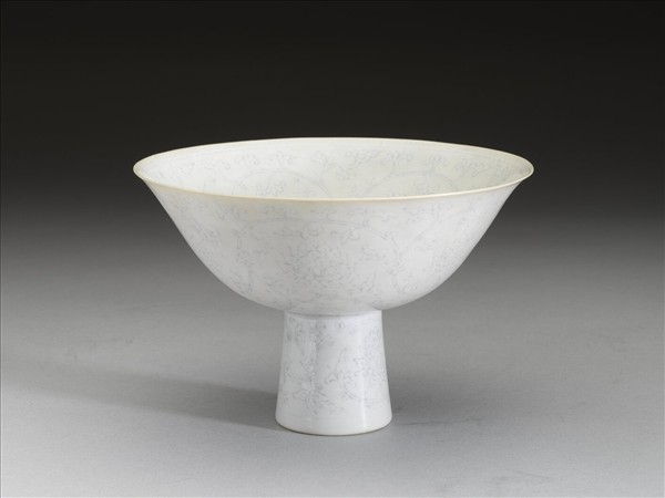 撇口,弧壁,高圈足,足部上窄下寬且中空,近底處微外侈。通體施白釉,白釉泛青,內、外壁飾纏枝番蓮六朵,足壁亦飾纏枝番蓮紋,高足上部與碗底接合處飾蓮瓣紋一周,內、外口沿及足之上下部各加飾細線二道,紋飾刻劃仿透雕效果。胎壁勻薄,足底露胎。碗心有「大清乾隆年製」雙行六字楷款,外加雙圈。