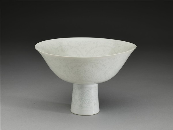 撇口,弧壁,高圈足,足部上窄下寬且中空,近底處微外侈。通體施白釉,白釉泛青,內、外壁飾纏枝番蓮六朵,足壁亦飾纏枝番蓮紋,高足上部與碗底接合處飾蓮瓣紋一周,內、外口沿及足之上下部各加飾細線二道,紋飾以刻劃線條仿透雕效果。胎壁勻薄,足底露胎。碗心有「大清乾隆年製」雙行六字楷款,外加雙圈。