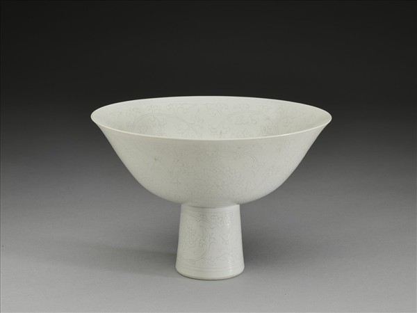 撇口,弧壁,高圈足,足部上窄下寬且中空,近底處微外侈。通體施白釉,白釉泛青,內、外壁飾纏枝番蓮六朵,足壁亦飾纏枝番蓮紋,高足上部與碗底接合處飾蓮瓣紋一周,內、外口沿及足之上下部各加飾細線二道,紋飾以刻劃線條仿透雕效果。胎壁勻薄,足底露胎。碗心有「大清乾隆年製」雙行六字楷款,外加雙圈。