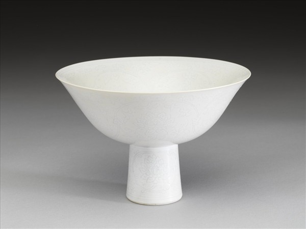 撇口,弧壁,高圈足,足部上窄下寬且中空,近底處微外侈。通體施白釉,白釉泛青,內、外壁飾纏枝番蓮六朵,足壁亦飾纏枝番蓮紋,高足上部與碗底接合處飾蓮瓣紋一周,內、外口沿及足之上下部各加飾細線二道,紋飾以刻劃線條仿透雕效果。胎壁勻薄,足底露胎。碗心有「大清乾隆年製」雙行六字楷款,外加雙圈。