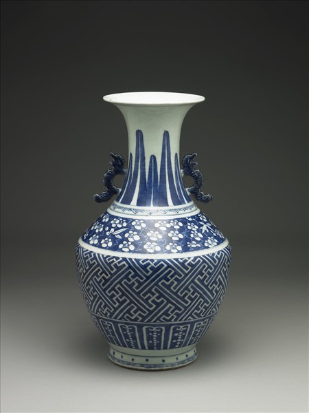 瓶口外翻、長頸、斜肩,腹部上豐下收,底接圈足。頸兩側加飾藍彩雙耳。底面施釉、無款識標記。足底著地處露胎。器表以白地藍花和藍地白花穿插為飾。頸外畫蕉葉,中心留白。頸肩相接處環繞一圈尖角圖案,肩部繞飾一周藍底白梅冰裂紋,腹部為藍底白色卍字錦,近底處則接變形蓮瓣及圈點紋。從裝飾紋樣看,中心留白的蕉葉紋自十五世紀已出現,而卍字錦自十六世紀晚期已成為卡拉克樣式瓷器上經常可見的裝飾元素之一,其表現手法並且可概分成白地藍花、藍地白花和模印堆花等不同的式樣。至於冰梅紋亦同步流行於十七世紀,以碗礁一號沉船出土品為例,至少存在三種不同的樣式。最後回到此品的定年判斷,因考慮傳世存在一件裝飾藍地白卍字錦紋的瓷盤帶有康熙年款,以及康熙朝也生產以銅絲圈繪出冰梅紋圖案的掐絲琺瑯器,甚至連十二美人圖之一的「鑑古」軸中的仕女也穿著印有冰梅紋的衣服。再加上學界亦有將不規則冰裂紋看成是更早的順治朝紋樣等不一而足的觀點,遂讓筆者將此器看成是十七至十八世紀產物。同時透過留白蕉葉紋和卍字錦也出現在十七世紀末的伊萬里瓷器,進一步揭開因應西方市場的需求,中、日雙方既迴盪一股相互競爭、彼此消長的態勢,也醞釀出共通的裝飾風格。(取自《亞洲探險記:十七世紀東西交流傳奇》)