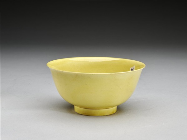 微撇口,深弧壁,矮圈足。全器內外壁均施黃釉,釉色濃艷明亮。外壁施釉至足際,足圈露胎,圈足內底施白釉,並書「大清康熙年製」六字雙行雙圈青花楷書款。