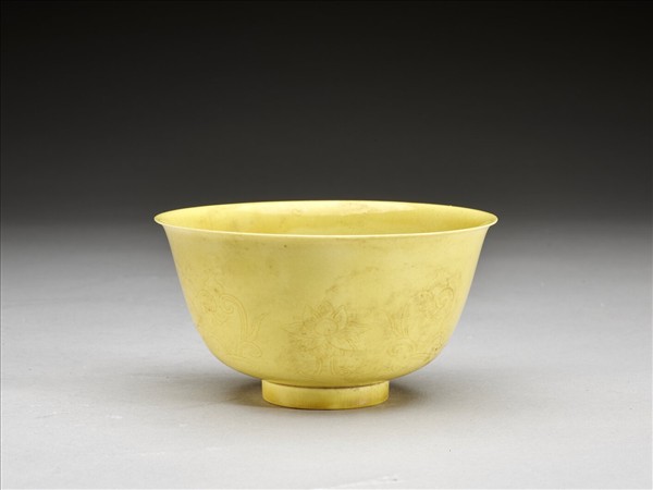 微撇口,深弧壁,矮圈足。全器內外壁均施黃釉,外壁施釉至足際,且刻劃番蓮紋等。足圈露胎,圈足內底施白釉,並書「大清康熙年製」六字雙行雙圈青花楷書款。