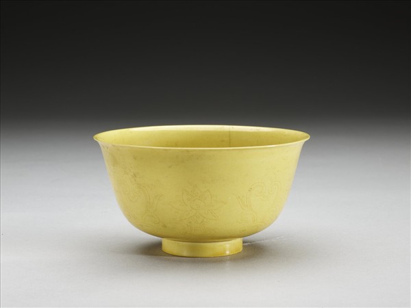 微撇口,深弧壁,矮圈足。全器內外壁均施黃釉,外壁施釉至足際,且刻劃番蓮紋等。足圈露胎,圈足內底施白釉,並書「大清康熙年製」六字雙行雙圈青花楷書款。