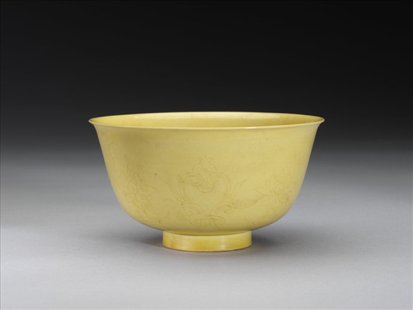 微撇口,深弧壁,矮圈足。全器內外壁均施黃釉,外壁施釉至足際,且刻劃番蓮紋等。足圈露胎,圈足內底施白釉,並書「大清康熙年製」六字雙行雙圈青花楷書款。