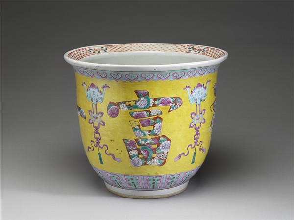 筒形花盆,撇口、矮圈足,器底開一排水孔。器身黃彩為地,裝飾富、貴、吉、祥四大字及蝙蝠、綬帶紋。紋飾內再填入紅、黃、綠各色牡丹及菊花等表示富貴、長壽的花卉。花盆的上下沿邊分別裝飾網格紋、如意雲紋及蕉葉紋,整體華麗富貴。此類吉祥字內再填入吉祥花卉的裝飾方式,為十九世紀中晚期瓷器的特色。