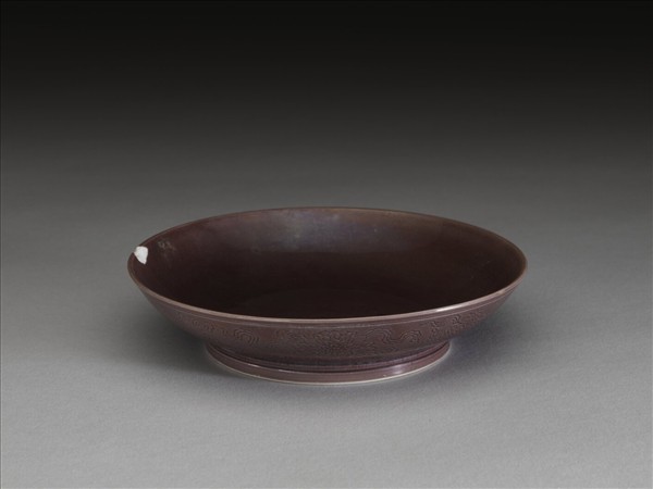 侈口、淺弧壁、矮圈足,施茄皮紫釉,外壁刻劃八寶紋一周,內壁無紋飾。圈足露胎,足底施白釉,有青花書「大清雍正年製」二行六字楷款,外加雙圈。