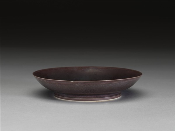 侈口、淺弧壁、矮圈足,施茄皮紫釉,外壁刻劃八寶紋一周,內壁無紋飾。圈足露胎,足底施白釉,有青花書「大清雍正年製」二行六字楷款,外加雙圈。