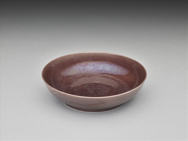侈口、淺弧壁、矮圈足,施茄皮紫釉,盤心刻劃桃實紋,外壁無紋飾。圈足露胎,足底施白釉,有青花書「大清雍正年製」二行六字楷款,外加雙圈。