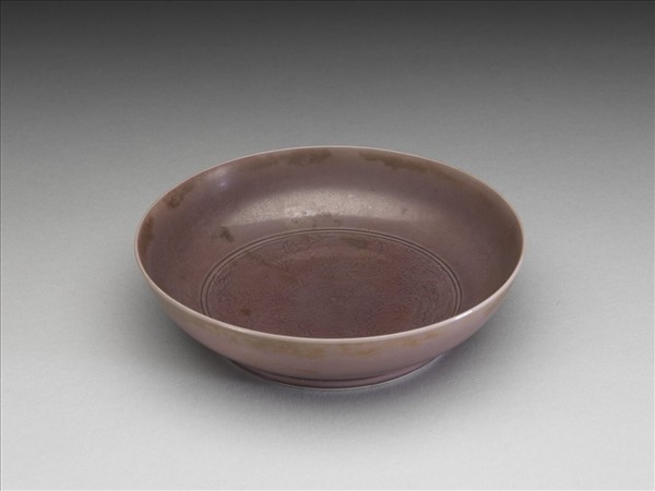 侈口、淺弧壁、矮圈足,施茄皮紫釉,盤心刻劃桃實紋,外壁無紋飾。圈足露胎,足底施白釉,有青花書「大清雍正年製」二行六字楷款,外加雙圈。