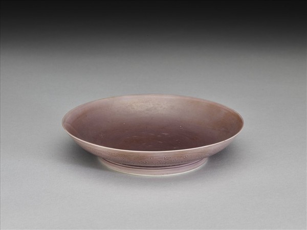 侈口、淺弧壁、矮圈足,施茄皮紫釉,外壁刻劃石榴紋,內壁無紋飾。圈足露胎,足底施白釉,有青花書「大清雍正年製」二行六字楷款,外加雙圈。