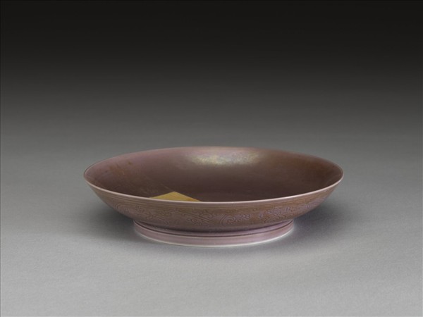 侈口、淺弧壁、矮圈足,施茄皮紫釉,外壁刻劃石榴紋,內壁無紋飾。圈足露胎,足底施白釉,有青花書「大清雍正年製」二行六字楷款,外加雙圈。