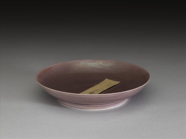 侈口、淺弧壁、矮圈足,施茄皮紫釉,外壁刻劃石榴紋,內壁無紋飾。圈足露胎,足底施白釉,有青花書「大清雍正年製」二行六字楷款,外加雙圈。