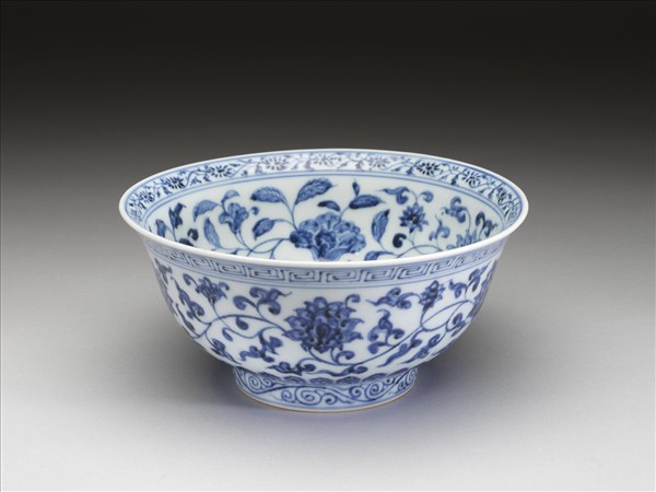 口微撇,深壁,矮圈足。薄胎白釉,內口沿畫青花轉枝小菊花一周,碗內底畫番蓮一枝,內壁畫青花纏枝牡丹、菊花等四季花卉五朵,外壁畫纏枝番蓮五朵;外口沿畫回紋一周,底邊畫蓮瓣紋,足圈有卷草紋。各紋飾間有青花弦紋相區隔。足圈露胎,圈足內底施白釉,並書「大明宣德年製」六字雙行雙圈青花楷書。