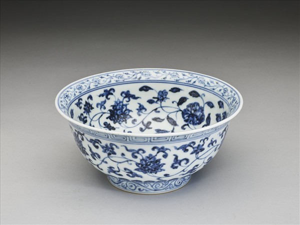 口微撇,深壁,矮圈足。薄胎白釉,內口沿畫青花轉枝小菊花一周,碗內底畫番蓮一枝,內壁畫青花纏枝牡丹、菊花等四季花卉五朵,外壁畫纏枝番蓮五朵;外口沿畫回紋一周,底邊畫蓮瓣紋,足圈有卷草紋。各紋飾間有青花弦紋相區隔。足圈露胎,圈足內底施白釉,並書「大明宣德年製」六字雙行雙圈青花楷書。