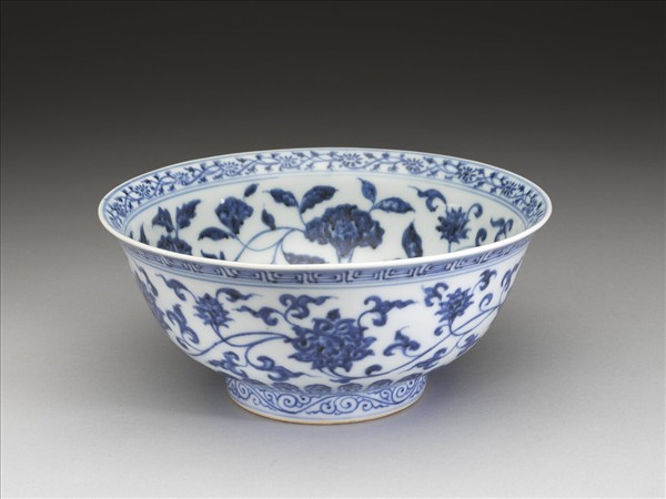 口微撇,深壁,矮圈足。薄胎白釉,內口沿畫青花轉枝小菊花一周,碗內底畫番蓮一枝,內壁畫青花纏枝牡丹、菊花等四季花卉五朵,外壁畫纏枝番蓮五朵;外口沿畫回紋一周,底邊畫蓮瓣紋,足圈有卷草紋。各紋飾間有青花弦紋相區隔。足圈露胎,圈足內底施白釉,並書「大明宣德年製」六字雙行雙圈青花楷書。