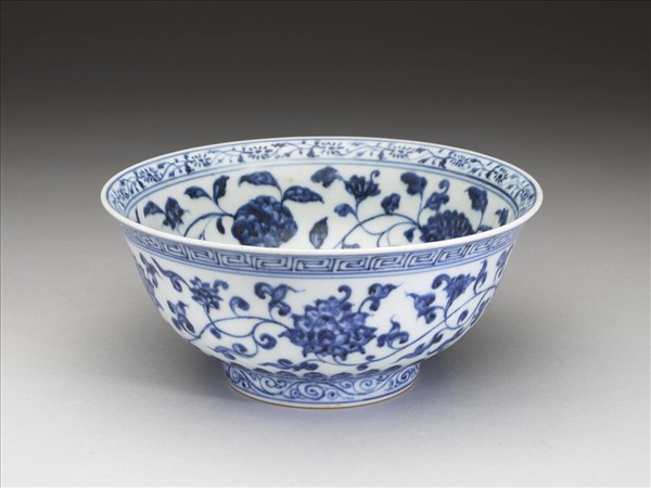 口微撇,深壁,矮圈足。薄胎白釉,內口沿畫青花轉枝小菊花一周,碗內底畫番蓮一枝,內壁畫青花纏枝牡丹、菊花等四季花卉五朵,外壁畫纏枝番蓮五朵;外口沿畫回紋一周,底邊畫蓮瓣紋,足圈有卷草紋。各紋飾間有青花弦紋相區隔。足圈露胎,圈足內底施白釉,並書「大明宣德年製」六字雙行雙圈青花楷書。