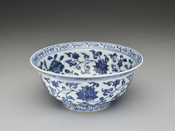 口微撇,深壁,矮圈足。薄胎白釉,內口沿畫青花轉枝小菊花一周,碗內底畫番蓮一枝,內壁畫青花纏枝牡丹、菊花等四季花卉五朵,外壁畫纏枝番蓮五朵;外口沿畫回紋一周,底邊畫蓮瓣紋,足圈有卷草紋。各紋飾間有青花弦紋相區隔。足圈露胎,圈足內底施白釉,並書「大明宣德年製」六字雙行雙圈青花楷書。