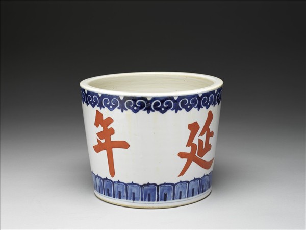 桶形花盆,直口、臥足,器底有一排水孔。胎質較厚,外壁四面用紅彩書寫「延年益壽」,口沿及底沿分繪青花如意雲紋及蕉葉紋一周。足緣露胎,底施白釉。