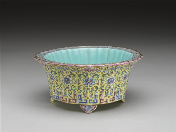 與故瓷1291為盆、托組。全器模製呈十二瓣蓮花型,撇口,斜壁坐於四雲頭足上。器內湖綠釉,器表檸檬黃,以紅、藍、綠等釉彩繪製纏枝番蓮、蝙蝠及變形磬紋,形成「福慶連連」的諧音意。器沿、支釘痕、器底及露胎的足底以金彩點畫,使全器達到滿釉的效果。造型精緻,色彩鮮亮。
